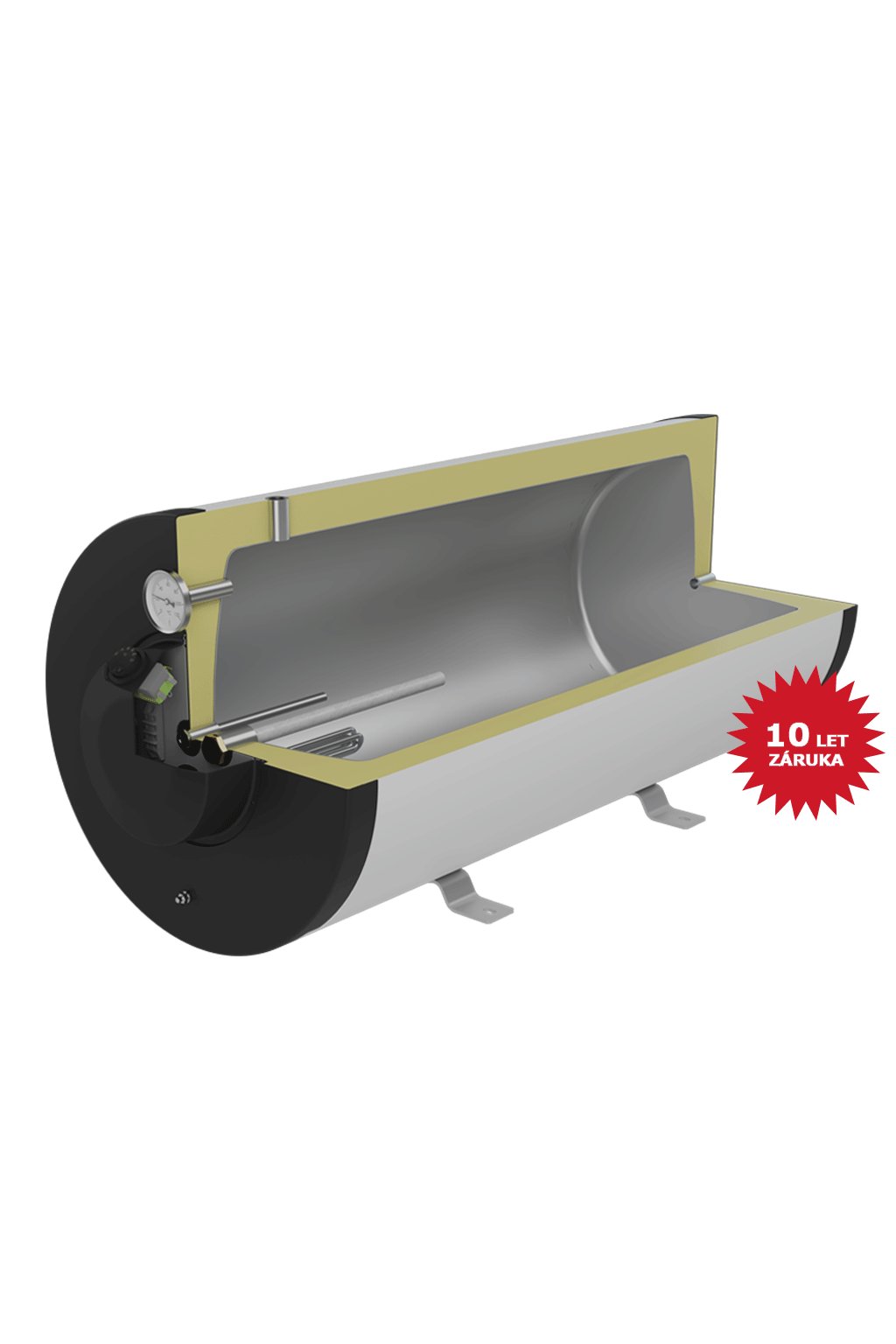 - Tepelná izolace ohřívače (tvrzená PUR pěna o síle 50 mm) zajišťuje minimální tepelné ztráty a nízké provozní náklady