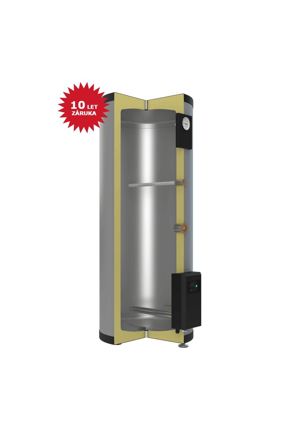 - Tepelná izolace ohřívače (tvrzená PUR pěna o síle 50 mm) zajišťuje minimální tepelné ztráty a nízké provozní náklady